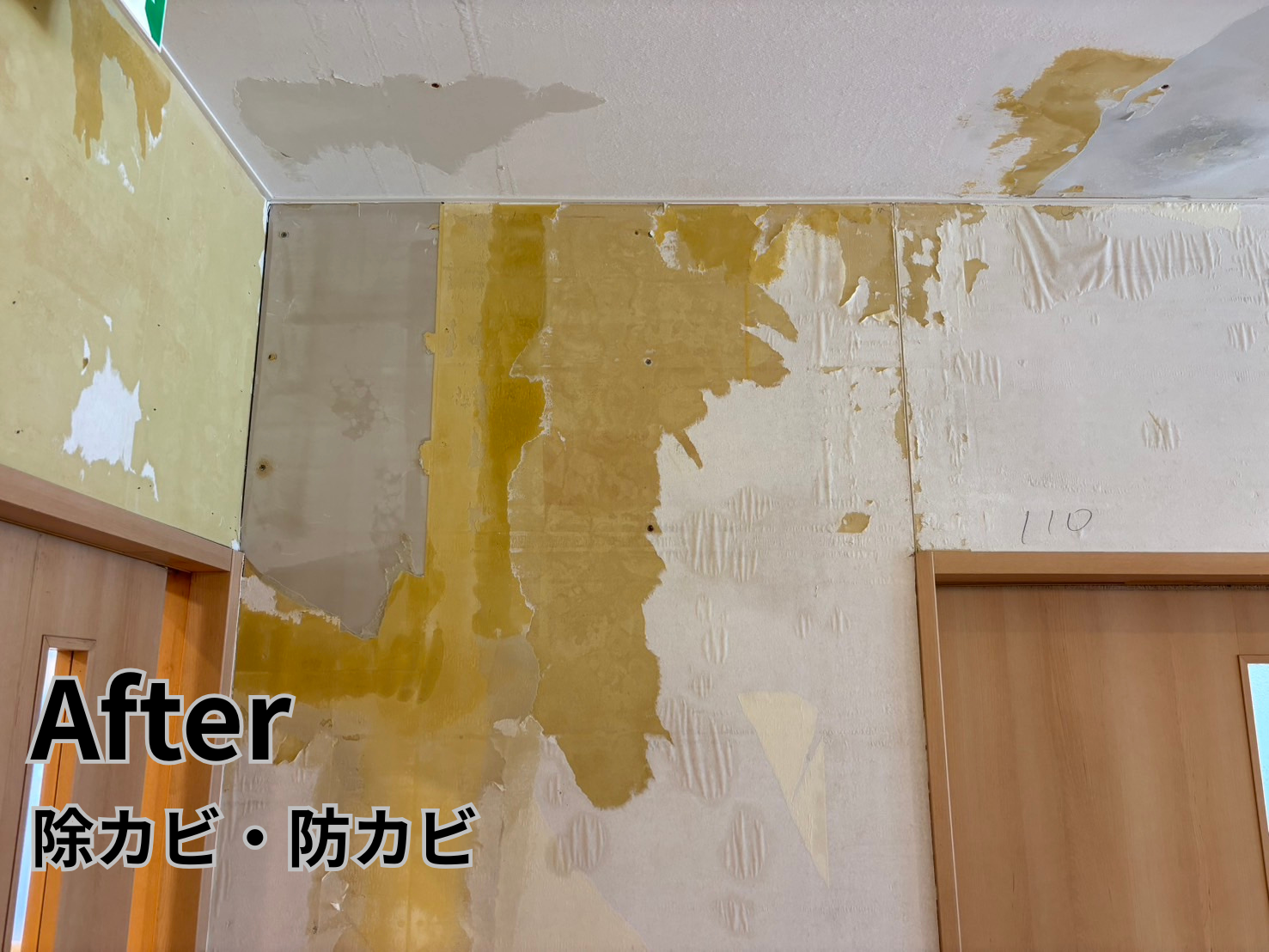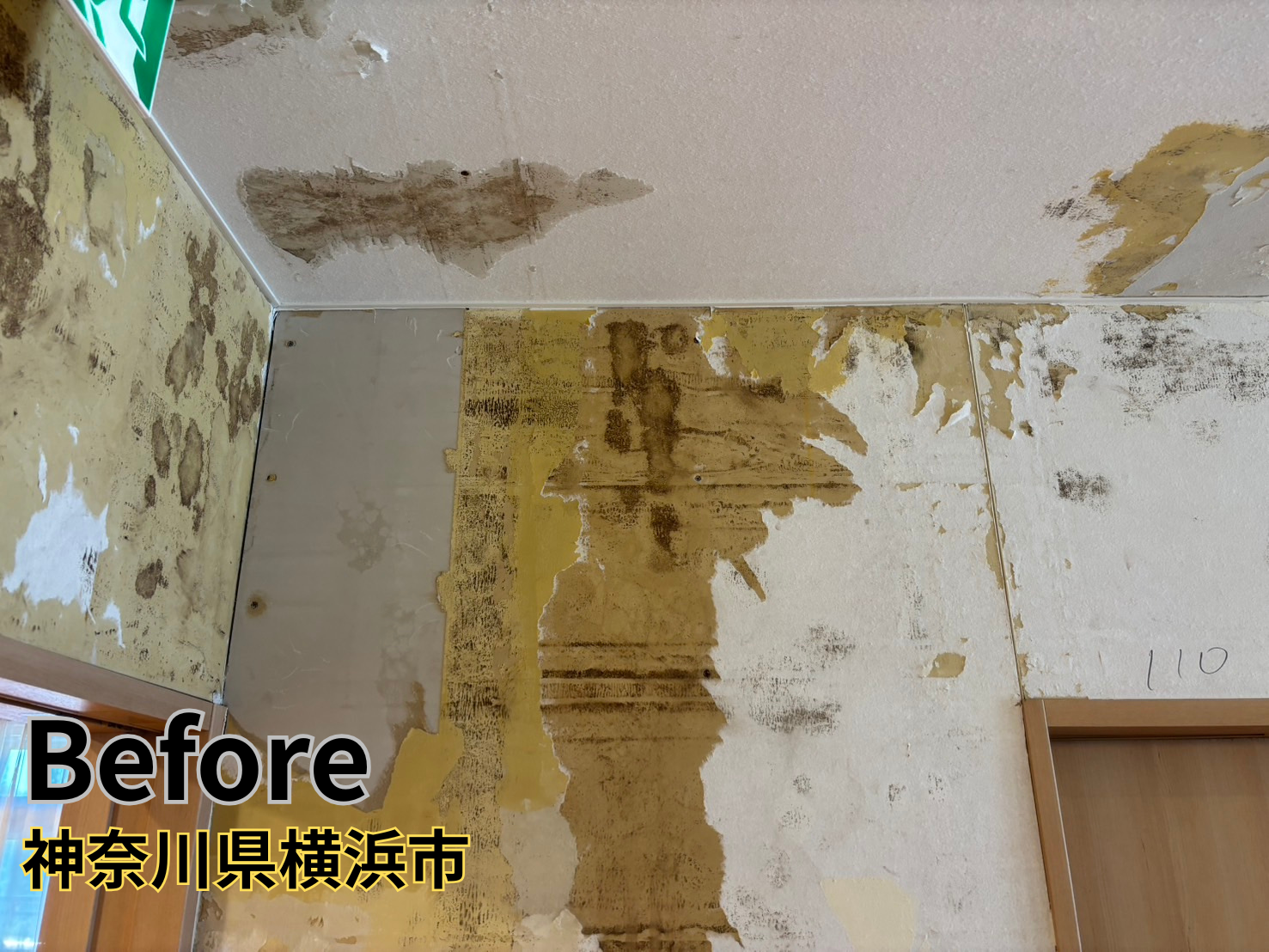 神奈川県横浜市にある介護施設にて、天井と壁面に発生していたカビの除去・防カビ施工、そしてクロスの貼り替えを行いました。