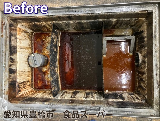 今回は、愛知県豊橋市の食品スーパー様にてグリストラップ清掃を行いました。