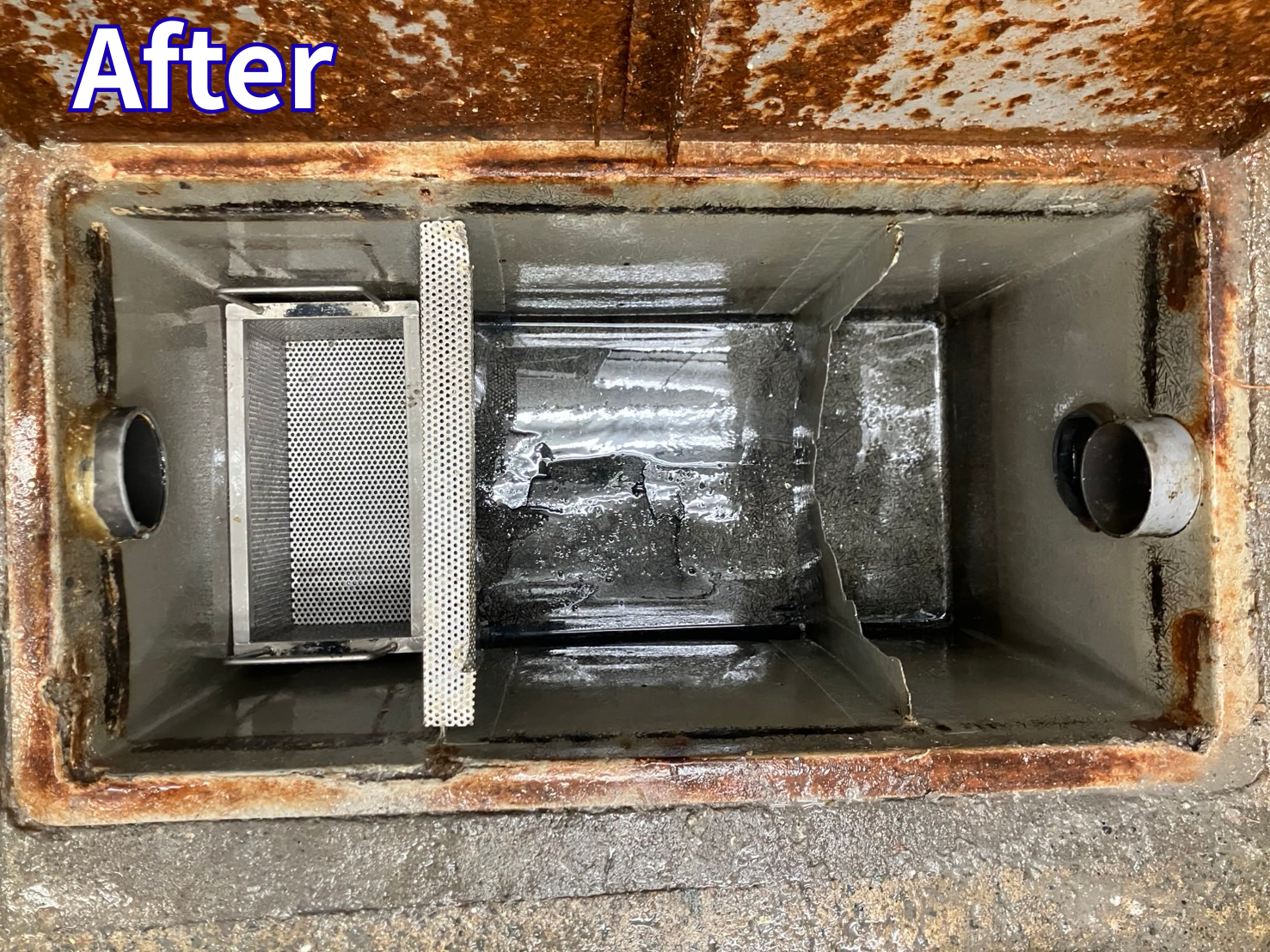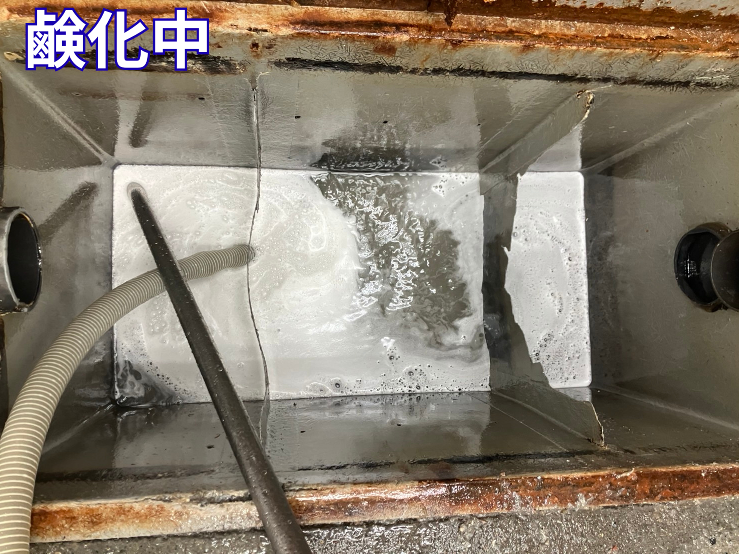 グリストラップ内部には、油脂や汚泥が厚く堆積している状態でした。
