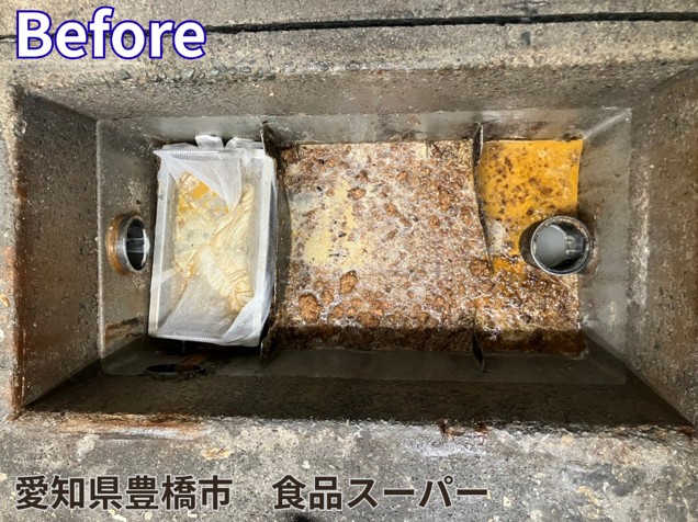 今回は、愛知県豊橋市の食品スーパー様にてグリストラップ清掃を行いました。