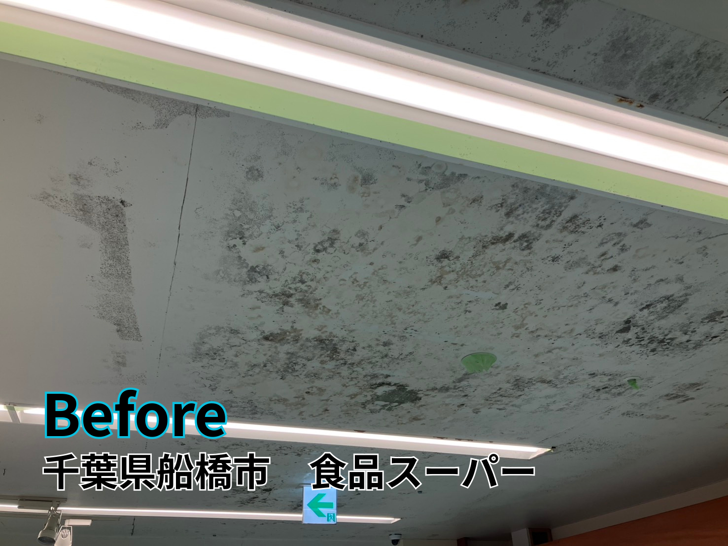 千葉県船橋市にある食品スーパー様にて、天井に発生したカビの清掃を行いました。